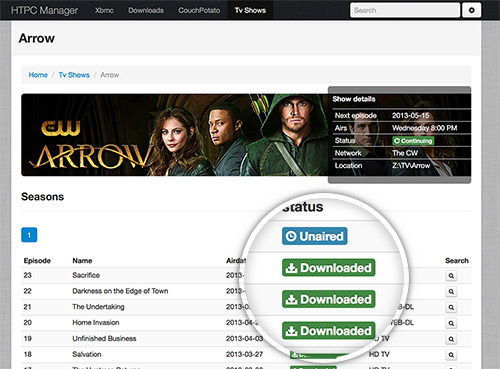 If you use Sick Beard to auto-download your TV shows, you can now do it all from within HTPC Manager. All features like: add new show, search episode, next up and show overview can be handled through HTPC Manager.